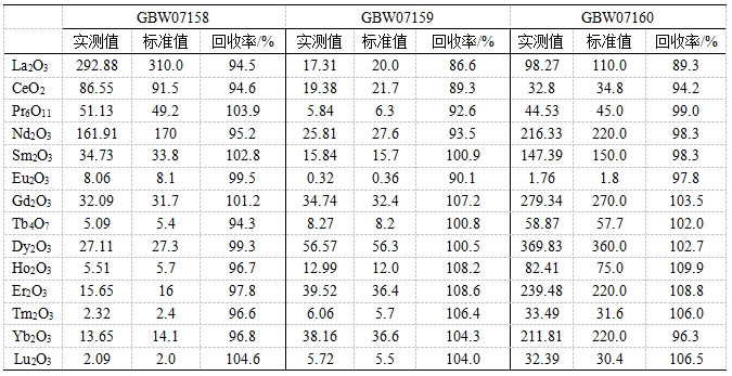 參考《GB/T 40798 離子型稀土原礦化學分析方法 稀土總量的測定 電感耦合等離子體質譜法》,采用氫氟酸、硝酸、高氯酸進行濕法消解。利用碰撞反應模式控制氧化物產率,降低輕稀土氧化物/氫氧化物對其他稀土元素的干擾;并根據(jù)實際樣品中元素含量,校準稀土氧化物/氫氧化物的干擾。對三個稀土礦標準物質中14種稀土元素(以氧化物形式表示)進行測試,各元素回收率為86.6 %~109.9%。