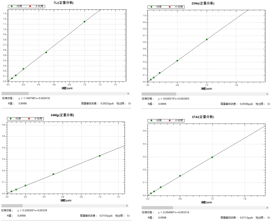 部分元素在冷焰模式下性能參數(shù)冷焰模式下,繪制各元素0,0.05,0.1,0.2,0.5,1.0μg/L系列濃度標液工作曲線,39K、40Ca、56Fe等同位素的線性相關(guān)系數(shù)r均大于0.999,背景等效濃度為0.0023μg/L~0.0217μg/L。