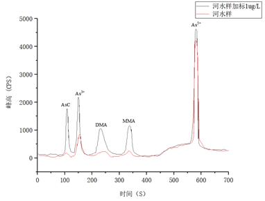 河水樣品及加標(biāo)1μg/L的測試結(jié)果詳見表4,樣品及加標(biāo)后砷形態(tài)疊加譜圖如圖5所示。