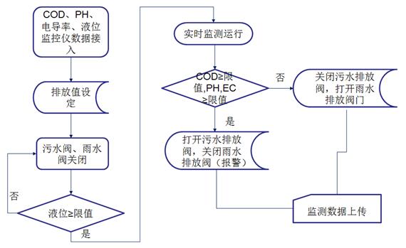 監(jiān)測系統(tǒng)控制采樣單元將水樣導(dǎo)入監(jiān)測室,并啟動監(jiān)測水質(zhì)的COD、pH、電導(dǎo)率等常規(guī)參數(shù)。達標(biāo)雨水通過電控閥門排入市政雨水管網(wǎng),一旦超標(biāo)電控閥門關(guān)閉,禁止雨水排入市政雨水管網(wǎng),并通過水泵將超標(biāo)雨水泵入企業(yè)污水處理系統(tǒng)處理,達標(biāo)后排放至市政污水管網(wǎng)。同時所有監(jiān)測數(shù)據(jù)經(jīng)由數(shù)據(jù)采集單元將數(shù)據(jù)統(tǒng)計后,由傳輸設(shè)備傳輸至企業(yè)監(jiān)測中心或環(huán)保局,由此完成對雨水排放自動、實時、連續(xù)監(jiān)控。