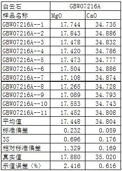 ④ .實(shí)際測(cè)試白云石國(guó)標(biāo)樣GBW07216A的數(shù)據(jù)如下為