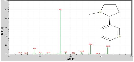 尼古丁(Nicotine),俗名煙堿,是一種存在于茄科植物(茄屬)中的生物堿,也是煙草的重要成分之一。尼古丁會(huì)使人上癮或產(chǎn)生依賴(lài)性,重復(fù)使用可導(dǎo)致心臟速度增加、血壓升高和食欲降低,攝入大劑量尼古丁會(huì)引起惡心甚至嘔吐,嚴(yán)重禍及死亡。氣相色譜質(zhì)譜聯(lián)用儀(GCMS),采用氣相色譜分離和電子轟擊電離源(EI)配合全掃描模式完成定性分析,GCMS-SIM模式實(shí)現(xiàn)定量分析,可應(yīng)用于煙草中尼古丁的檢測(cè)。