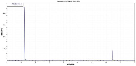 目標(biāo)物在5ppm-100ppm線(xiàn)性良好。取低含量尼古丁加標(biāo),樣品經(jīng)過(guò)乙酸乙酯超聲萃取。50ppm加標(biāo)水平下譜圖如下,得到了比較滿(mǎn)意的效果。