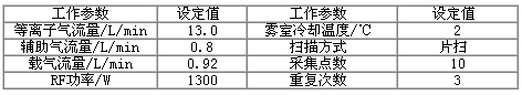 以10.0ng/mL Li 、Co 、In 、Ce 、U 和Bi混合調(diào)諧液優(yōu)化儀器工作參數(shù),使儀器靈敏度最佳,同時(shí)確保氧化物及雙電荷產(chǎn)率低于3%,具體工作參數(shù)見表1。在儀器最佳工作參數(shù)條件下,以內(nèi)標(biāo)法進(jìn)行測試。