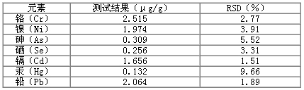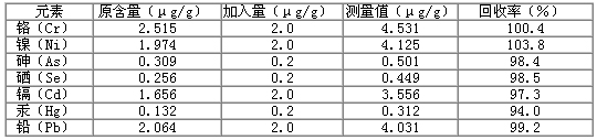 Hg標(biāo)液單獨(dú)為一組。Cr 、Ni 、As 、Se 、Cd 和Pb 標(biāo)液用各元素10μg/mL的標(biāo)液稀釋至所需濃度。配制Hg標(biāo)液時(shí)加入0.1mL 20 μg/mL金標(biāo)準(zhǔn)溶液。分析結(jié)果(表2)顯示,這7種元素的線性方程的相關(guān)系數(shù)為0.9996~1.000 ,檢出限為0.008~0.165ng/mL。