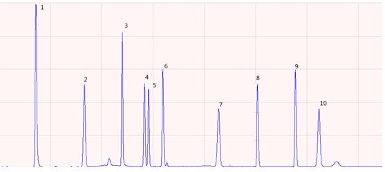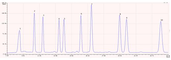 圖2.多溴聯(lián)苯標準樣品色譜圖