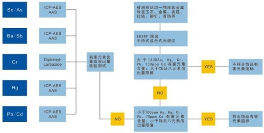 另外XRF由于只是測(cè)試元素的總含量,而無(wú)法進(jìn)行溶出量的檢測(cè),我們可以通過XRF測(cè)試元素總量是否超過了溶出量最大限量,如果超過溶出量最大限量,則必須通過其他光譜分析檢測(cè)設(shè)備(如ICP、AAS)來確定元素的溶出量是否超過了最大限量,所以如果要全方位的解決飾品中有害元素檢測(cè)解決方案,單只靠XRF是無(wú)法全部做到的,還要進(jìn)行其它分析測(cè)試,下圖表示XRF檢測(cè)飾品有害元素的篩選性初檢分析方法:
