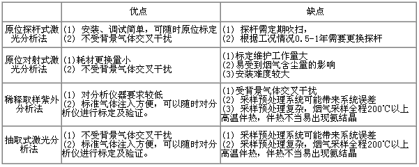 脫硝氨逃逸濃度的量級一般都是幾個ppm,對其準(zhǔn)確測量比較困難。目前國內(nèi)外用于煙氣脫硝系統(tǒng)氨逃逸在線監(jiān)測的方法主要有以下幾種,優(yōu)缺點如下: