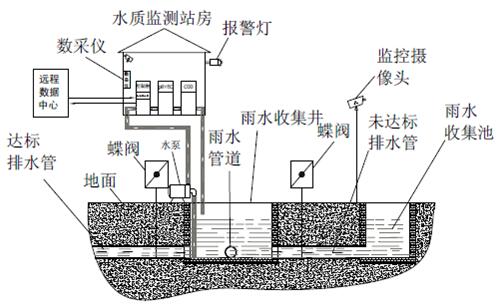 監(jiān)測系統(tǒng)控制采樣單元將水樣導(dǎo)入監(jiān)測室,并啟動監(jiān)測水質(zhì)的COD、pH、電導(dǎo)率等常規(guī)參數(shù)。達(dá)標(biāo)雨水通過電控閥門排入市政雨水管網(wǎng),一旦超標(biāo)電控閥門關(guān)閉,禁止雨水排入市政雨水管網(wǎng),并通過水泵將超標(biāo)雨水泵入企業(yè)污水處理系統(tǒng)處理,達(dá)標(biāo)后排放至市政污水管網(wǎng)。同時所有監(jiān)測數(shù)據(jù)經(jīng)由數(shù)據(jù)采集單元將數(shù)據(jù)統(tǒng)計后,由傳輸設(shè)備傳輸至企業(yè)監(jiān)測中心或環(huán)保局,由此完成對雨水排放自動、實時、連續(xù)監(jiān)控。