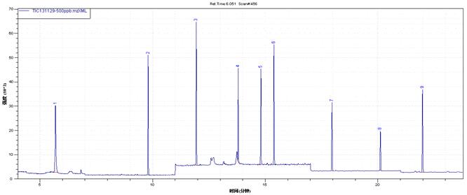 水樣經(jīng)固相萃取柱濃縮、凈化、洗脫后,氮吹定容到一定體積,過濾后樣品經(jīng)氣相色譜分離后,用質(zhì)譜進行檢測。通過與待測目標物標準質(zhì)譜圖相比較和保留時間進行定性,外標法定量。