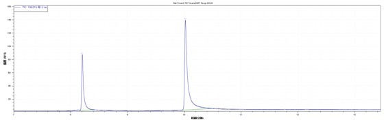 目標(biāo)物在5ppm-100ppm線性良好。取空白食品樣品加標(biāo),樣品經(jīng)過(guò)正己烷和乙酸乙酯(1+1)超聲萃取。20ppm加標(biāo)水平下譜圖如下,得到了比較滿意的效果。