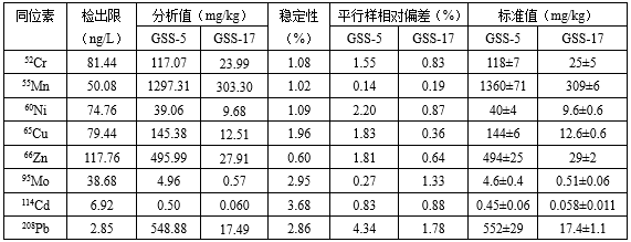 在優(yōu)化的儀器工作參數(shù)下,建立標準溶液工作曲線(線性相關系數(shù)達0.999以上),再分別取待測溶液上清液上機測試。其中:取兩個平行樣測試結果的平均值為分析值;對樣品空白溶液平行測定11次,計算11次測試結果的SD,以3×SD/k(k為標準溶液工作曲線的斜率)對應的值為方法檢出限。取一份GSS-17樣品溶液進行穩(wěn)定性考查,即間隔2min采集一個數(shù)據(jù),連續(xù)采集7組數(shù)據(jù),計算7組數(shù)據(jù)的RSD,作為穩(wěn)定性指標。所得實驗數(shù)據(jù)見表4。