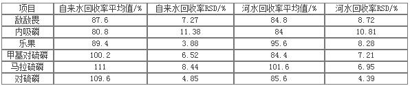 在自來水和河水中加入0.5ug 6種有機(jī)磷混標(biāo),分別作三次平行樣,按處理樣品的方法進(jìn)行樣品前處理,GC-MS 6800測(cè)試,采用外標(biāo)法定量,計(jì)算其回收率,數(shù)據(jù)見下表: